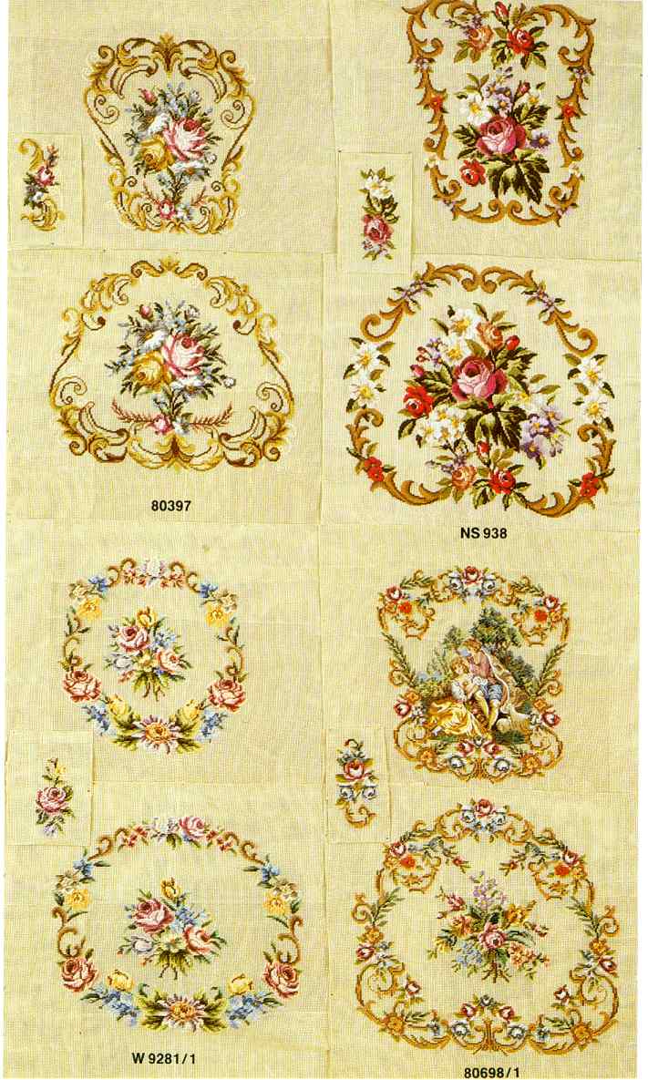 Gobelin-Sessel 1/3 Die Muster sind in Handarbeit vorgestickt. Der Hintergrund ist noch zum Sticken. Der Stramin besteht aus Baumwolle, die Stickerei aus Schurwolle.