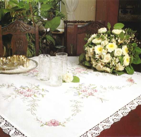 FHA 9281.D8080 Blumenstrauß mit Schleife, Tischdecke Komplett-Stickpackpackung 80x80 cm, Kreuzstich, Stoff "10" mit Spitze, 100% Baumwolle