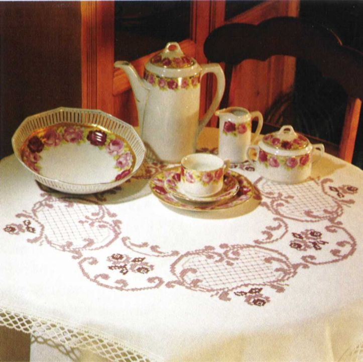 FHA 9591.D40100 Kaffee-Röschen Tischläufer Komplett-Stickpackung 40x100 cm, Kreuzstich, Stoff 10 weiß mit Spitze, 100% Baumwolle
