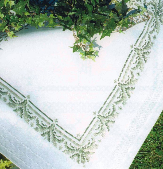 FHA 9854.C8080 Grüne Bordüre Tischdecke Komplett-Stickpackung 80x80 cm, Kreuzstich, Decke "Venezia", Farbe elfenbein, 100% Acryl