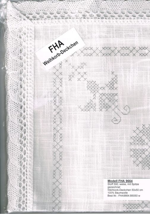 FHA 9664.B5050w Weihkorbdeckchen vorgezeichnet 50x50 cmStoff 590 weiß mit Spitze, 100% Baumwolle