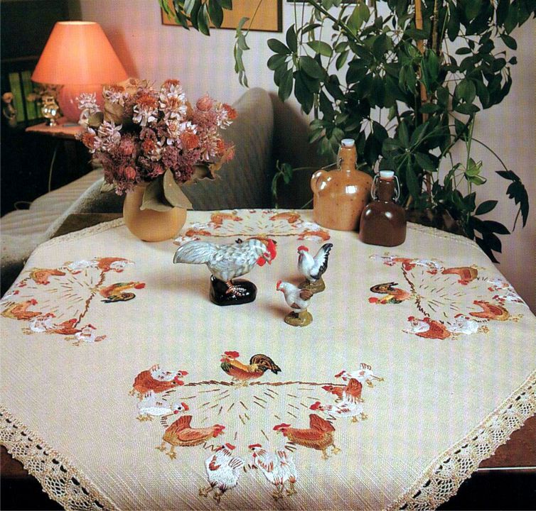 FHA 6490.B8585 Hühnerhof Tischdecke vorgezeichnet 85x85 cm, Spannstich, Stoff 342 natur mit Spitze, 100% Acryl