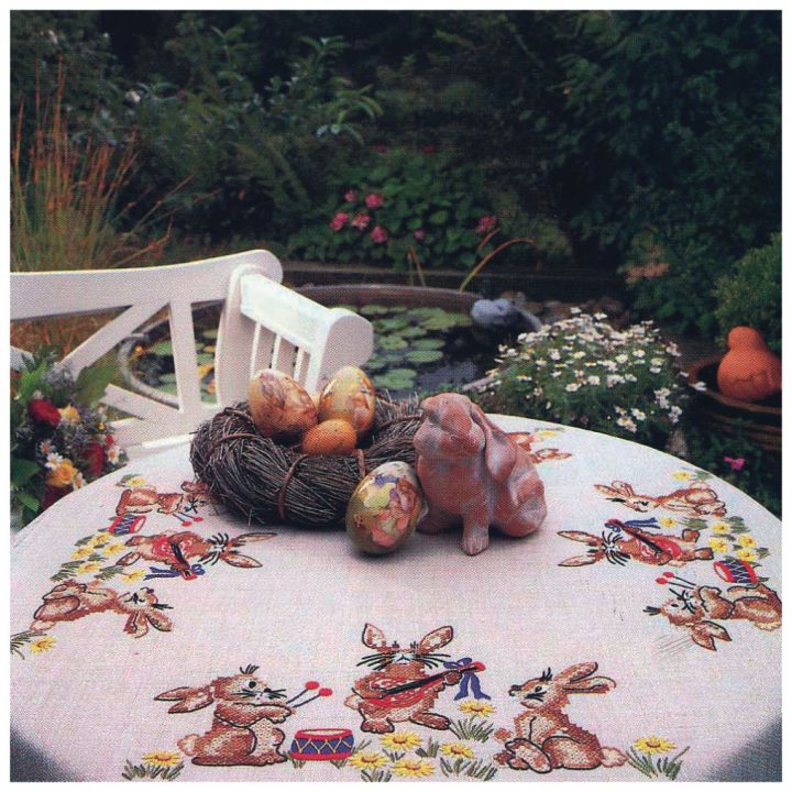 FHA 9514.A9090 Hasenkonzert Tischdecke vorgezeichnet 90x90 cm, Kreuzstich, Fertigranddecke "Toscana" natur, 100% Acryl
