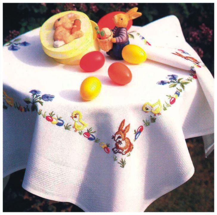 FHA 9618.A8080 Häschen & Küken Tischdecke vorgezeichnet 80x80 cm, Spannstich, Fertigranddecke "Venezia", elfenbein, 100% Acryl