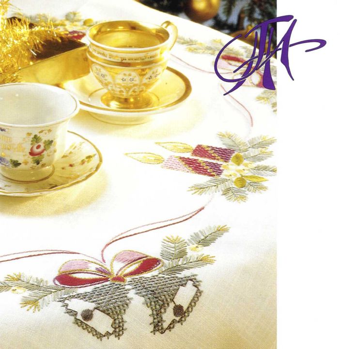 FHA 9872.C9090 Kerzen & Glocken Tischdecke Komplett-Stickpackung 90x90 cm, Kreuzstich, Fertigranddecke "Toscaa" natur, 100% Acryl