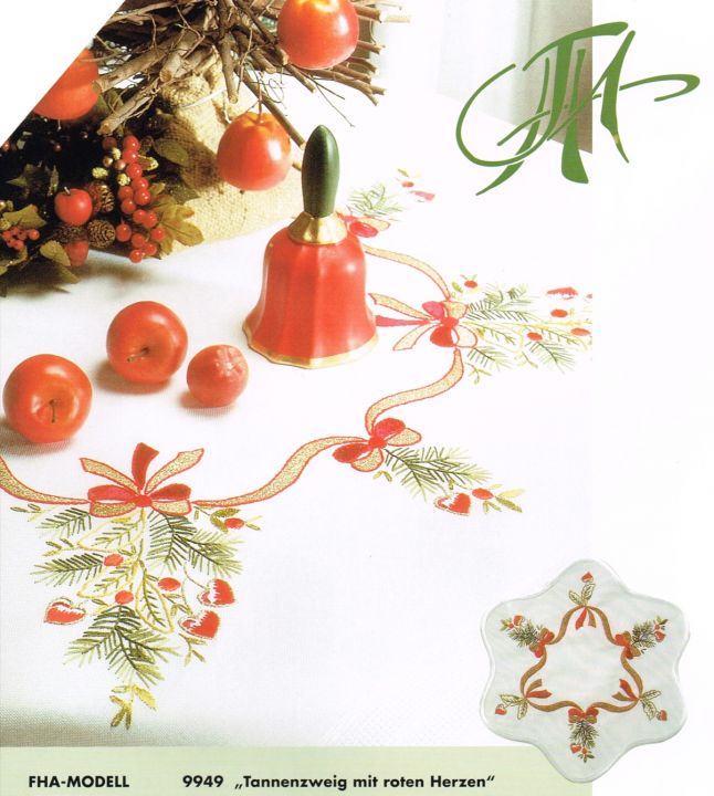 FHA 9949.C40 Stern Tannenzweig mit roten Herzen Komplett-Stickpackung 40 cm Sternform, Stoff 10, weiß, weiß paspoliert, 100% Baumwolle