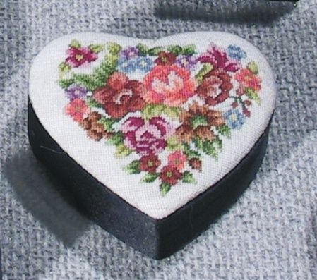 D019w Herzdose schwarz Deckel: weiß petit point, ca. 8x8 cm, Handarbeit